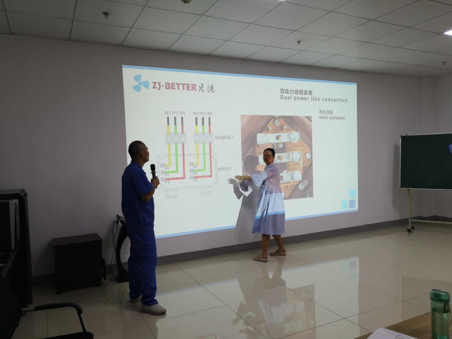 次日清晨,便于公司大樓衢州西聯(lián)大廈組織歡迎儀式,兩方團隊特此交流認識,以便更好的開展為期一周的學習交流會。圖為中國·貝德科技有限公司專業(yè)研發(fā)人員邱師傅為馬爾代夫客戶團隊講解電機基礎知識以及電機的整個生產(chǎn)工藝。為幫助馬爾代夫客戶團隊更好的理解,同時特別安排專業(yè)翻譯,為現(xiàn)場學習的國際友人做精準翻譯。