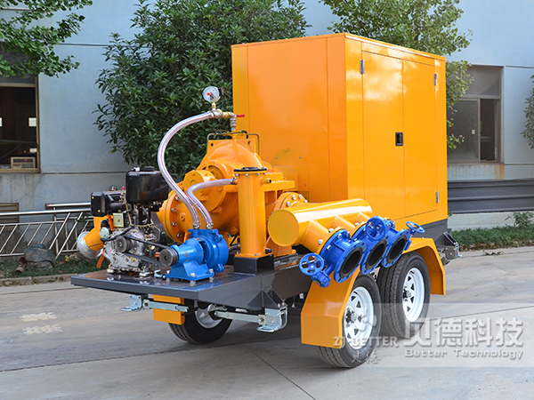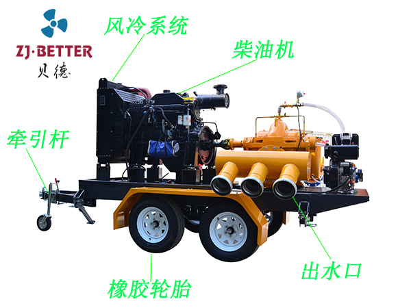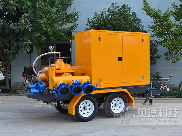 大流量防汛排澇移動(dòng)泵車是貝德科技在同類國(guó)內(nèi)外產(chǎn)品的技術(shù)基礎(chǔ)上研發(fā)的具有結(jié)構(gòu)緊湊、流量大、機(jī)動(dòng)靈活、操作方便,維護(hù)方便、能吸排具有顆粒性雜質(zhì)和長(zhǎng)纖維物質(zhì)的移動(dòng)排水設(shè)備。 主要由柴油機(jī)、聯(lián)軸器、泵頭、葉輪、后蓋、機(jī)械密封、泵軸、軸承座、進(jìn)口閥、氣液分離管、加水閥門、進(jìn)、排接管、防雨機(jī)柜、四輪移動(dòng)拖車等組成。